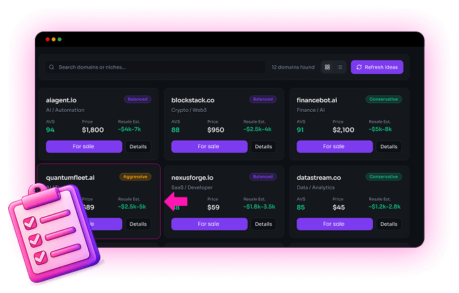 Stop browsing thousands of random listings. The AI scans real sales data, demand signals, and trending keywords to surface domains with proven market interest.